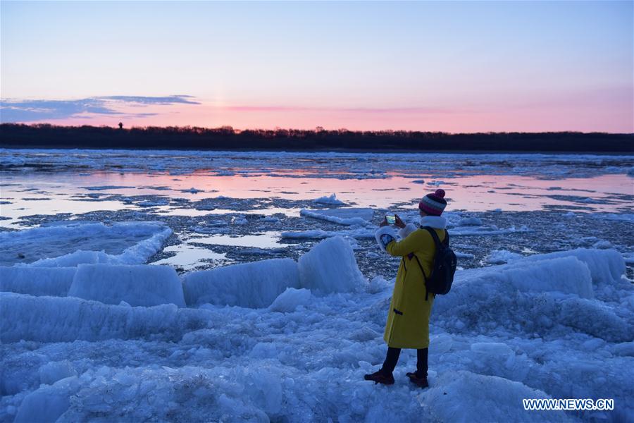 Une touriste prend des photos de la fonte des glaces dans la section Huma de la rivière Heilongjiang dans la province du Heilongjiang (nord-est de la Chine), le 3 mai 2019. (Xinhua/Zhou Changping)
