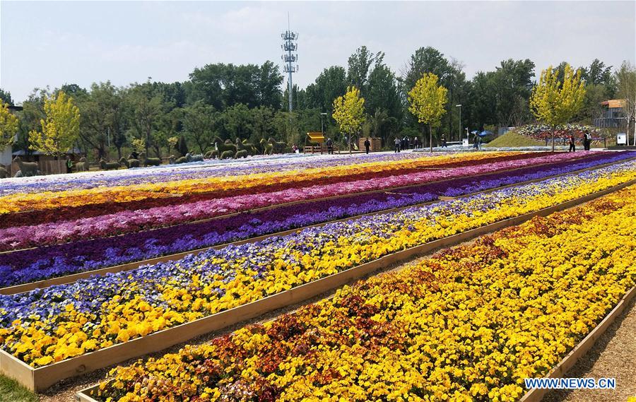 Photo prise avec un téléphone portable montrant des fleurs épanouies lors de l'Exposition horticole internationale 2019 de Beijing dans l'arrondissement de Yanqing à Beijing, capitale de la Chine, le 9 mai 2019. (Xinhua/Wei Mengjia)