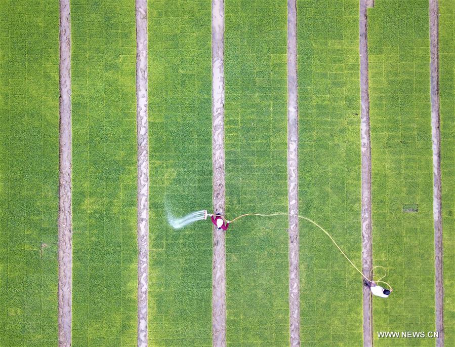 Une agricultrice arrose des semis de riz dans les champs au bourg de Liuzhen dans le district de Quanjiao de la province de l'Anhui (centre de la Chine), le 13 mai 2019. (Xinhua/Liu Junxi)