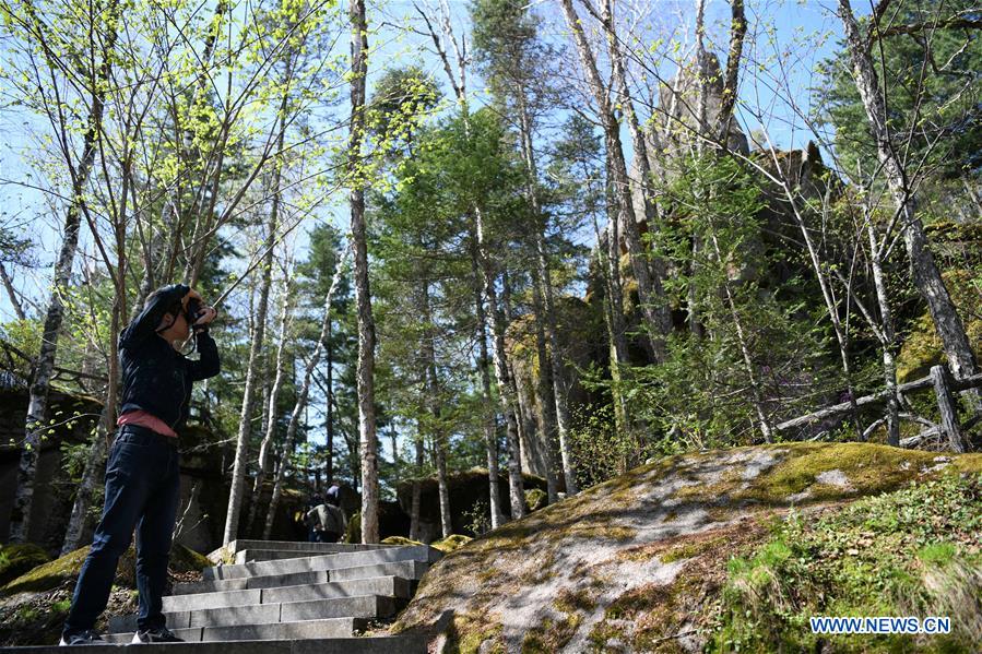 Un touriste prend des photos dans le Parc national forestier de Shilin dans les monts du Petit Khingan à Yichun, dans la province du Heilongjiang (nord-est de la Chine), le 15 mai 2019. (Xinhua/Wang Jianwei)