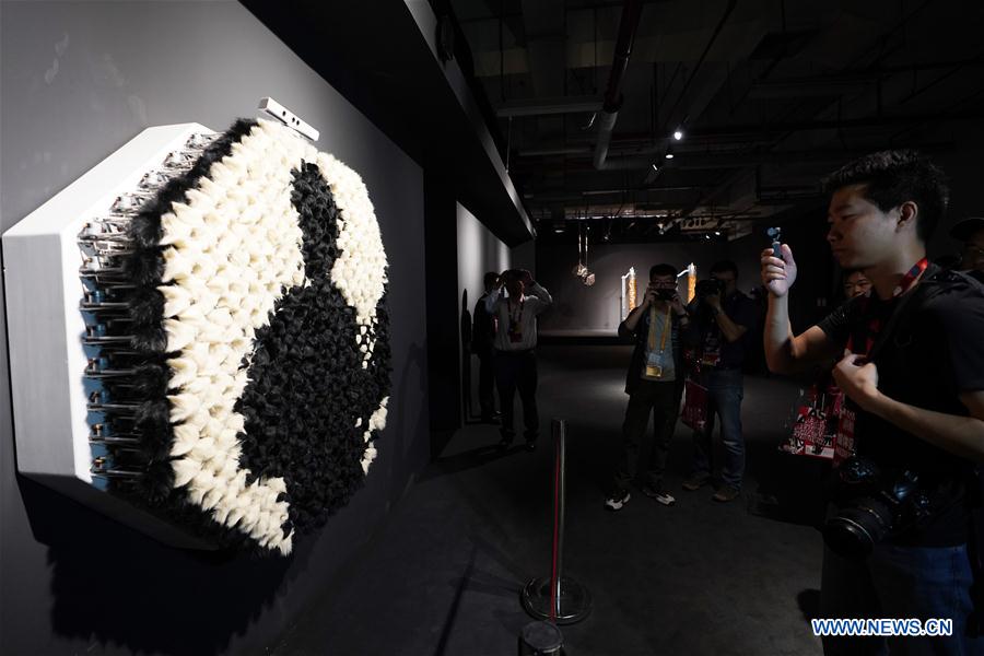 Des visiteurs admirent une œuvre d'art lors de l'Exposition d'art numérique de l'Asie qui s'est tenue à Beijing, capitale de la Chine, le 16 mai 2019. L'exposition, qui fait partie des activités culturelles de la Conférence sur le dialogue des civilisations asiatiques, a débuté jeudi. (Xinhua/Ju Huanzong)