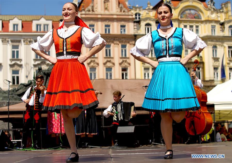 PRAGUE, 3 juin (Xinhua) -- Des artistes dansent pendant le festival "Prague -- Coeur des nations", à Prague, en République tchèque, le 2 juin 2019. Le festival artistique des minorités ethniques "Prague -- Coeur des nations" se déroule du 30 mai au 3 juin à Prague. Une trentaine de troupes venant des quatre coins du monde ont présenté des danses et chansons traditionnelles à cette occasion. (Photo : Dana Kesnerova)