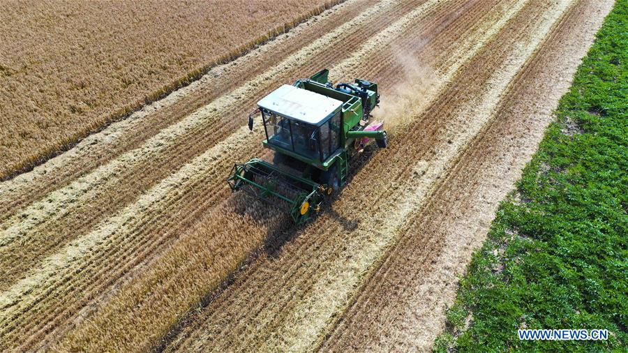Une machine agricole travaille dans les champs au village de Zhaoqiao à Bozhou, ville de la province de l'Anhui (est de la Chine), le 2 juin 2019. (Xinhua/Liu Qinli)