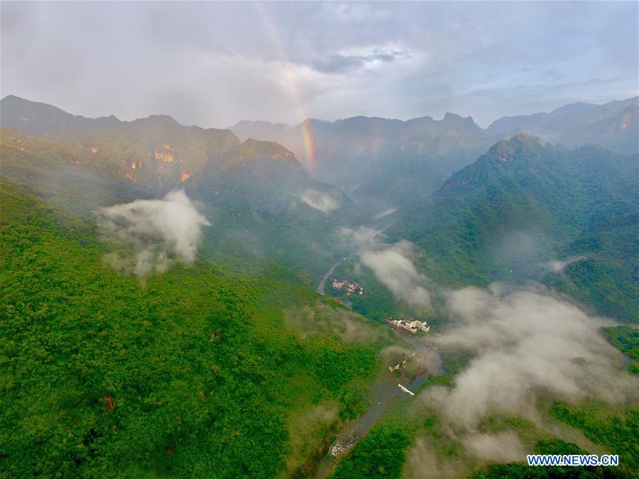Photo aérienne prise le 26 juin 2019 montrant le paysage du site pittoresque de Shibachongxi après une pluie à Fuzhou, dans la province du Fujian (sud-est de la Chine). (Xinhua/Jiang Kehong)