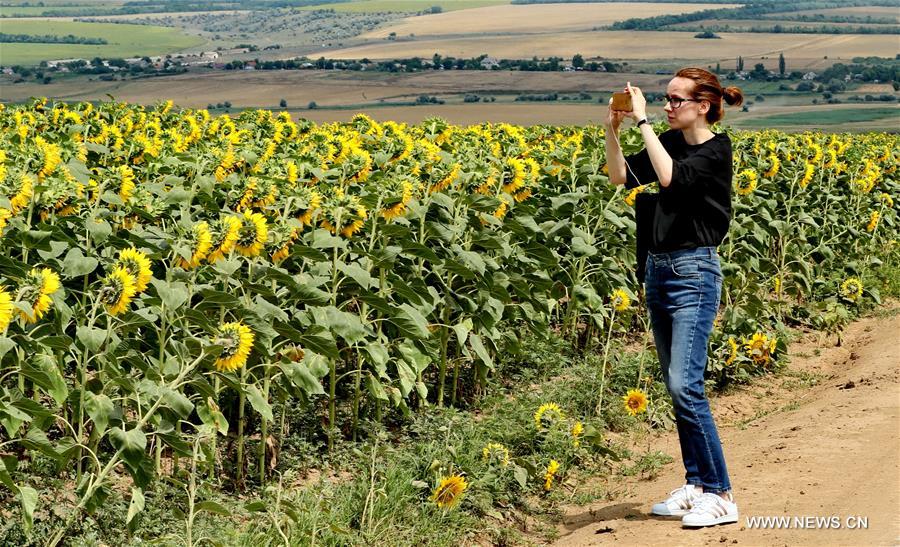 Une touriste prend des photo de champs de tournesols à Odessa en Ukraine, le 9 juillet 2019. (Xinhua/Chen Junfeng)