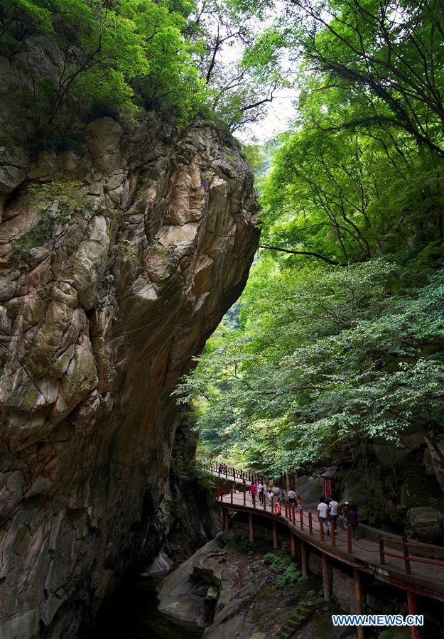 Des touristes visitent le Parc forestier national de Taiping à Xi'an, dans la province du Shaanxi (nord-ouest de la Chine), le 15 juillet 2019. (Xinhua/Liu Xiao)