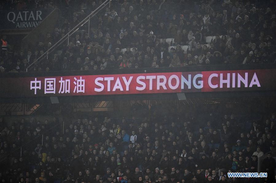 PARIS, 24 février (Xinhua) -- Un message disant "Bon courage la Chine" en anglais et en chinois est affiché sur l'écran lors d'un match de football de Ligue 1 entre le Paris Saint-Germain et Bordeaux, à Paris, en France, le 23 février 2020. (Photo : Jack Chan)