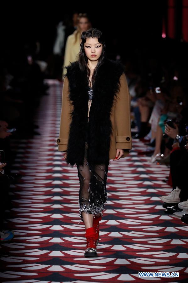 Un mannequin présente une création de la collection prêt-à-porter automne-hiver 2020-2021 de Miu Miu, lors de la semaine de la mode féminine de Paris, en France, le 3 mars 2020. (Xinhua/Piero Biasion)
