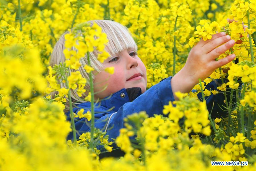 Un garçon s'amuse dans un champ de fleurs de colza à Minsk, capitale de la Biélorussie, le 19 mai 2020. (Xinhua/Henadz Zhinkov)