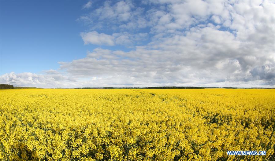 Photo prise le 20 mai 2020 montrant la vue d'un champ de fleurs de colza à Minsk, capitale de la Biélorussie. (Xinhua/Henadz Zhinkov)