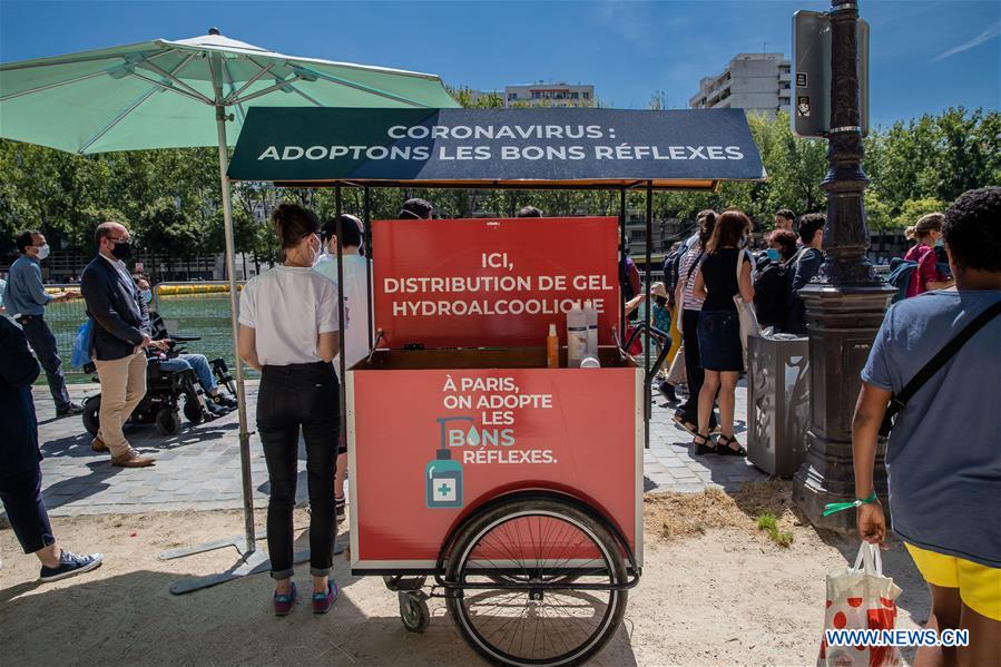 PARIS, 19 juillet (Xinhua) -- Photo des désinfectants dans le Bassin de la Villette lors de l'événement Paris Plages à Paris, en France, le 18 juillet 2020. L'événement Paris Plages se tient du 18 juillet au 30 août, et s'articule autour d'événements et activités sur les rives de la Seine et dans le Bassin de la Villette. (Photo : Aurelien Morissard)