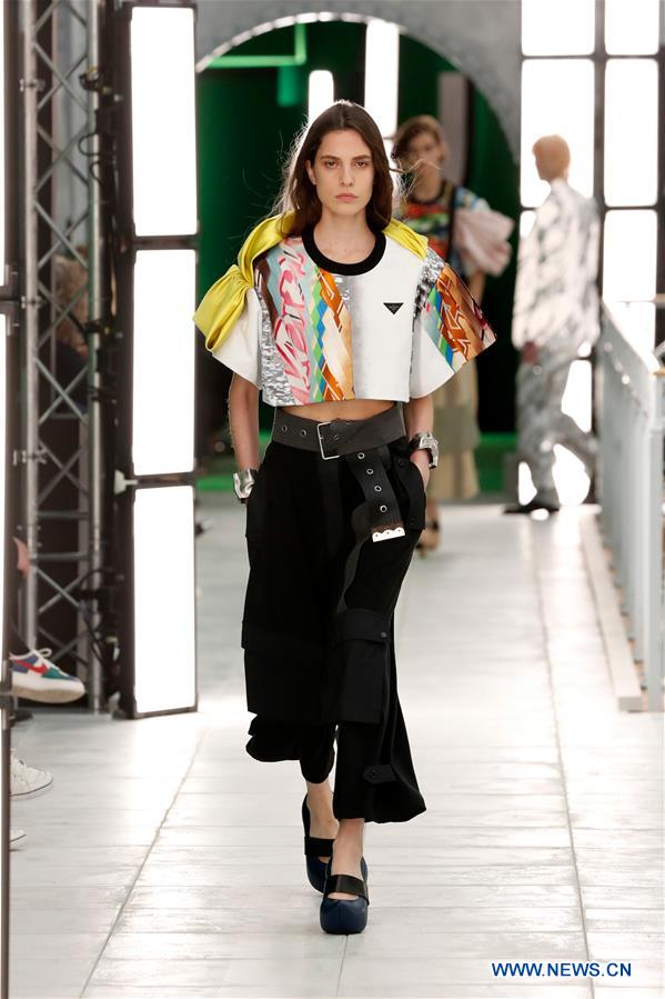 Un mannequin présente une création de la collection prêt-à-porter printemps/été 2021 de Louis Vuitton lors de la semaine de la mode de Paris, en France, le 6 octobre 2020. (Xinhua/Piero Biasion)