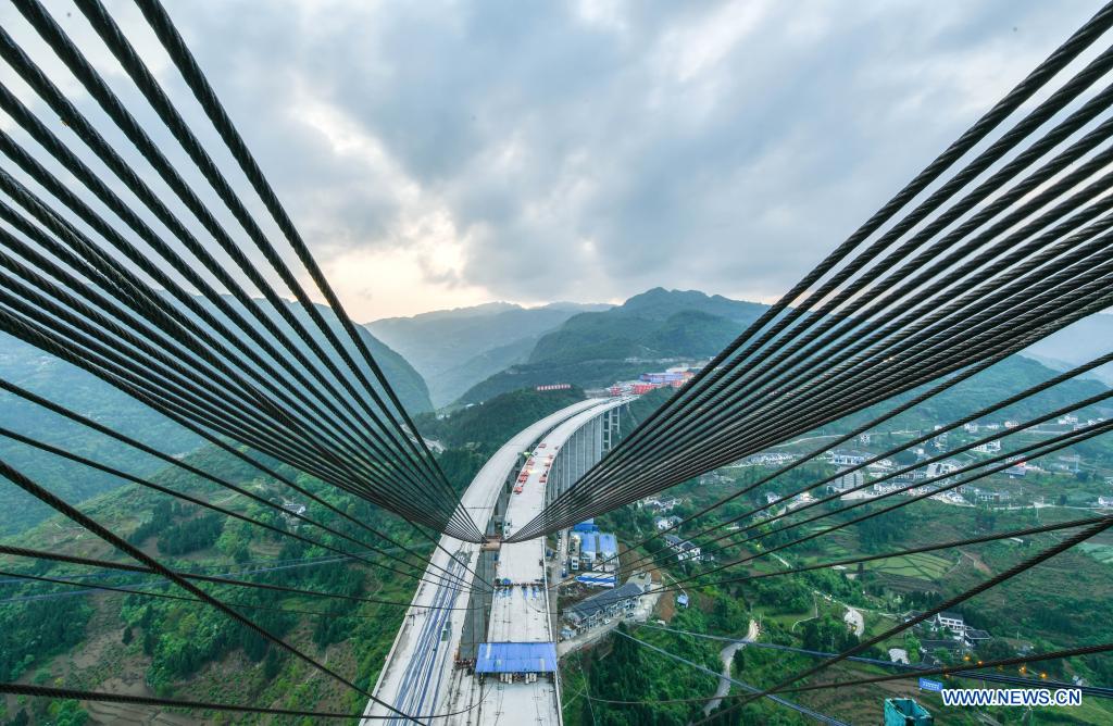 ZUNYI, 23 avril (Xinhua) -- Aperçu du chantier du grand pont de Dafaqu de l'autoroute Renhuai-Zunyi dans la province chinoise du Guizhou (sud-ouest), le 21 avril 2021. Le pont, d’une longueur de 1.427 mètres et d’une largeur de 33 mètres, est l’un des projets clés le long de l'autoroute. (Photo : Yang Wenbin)
