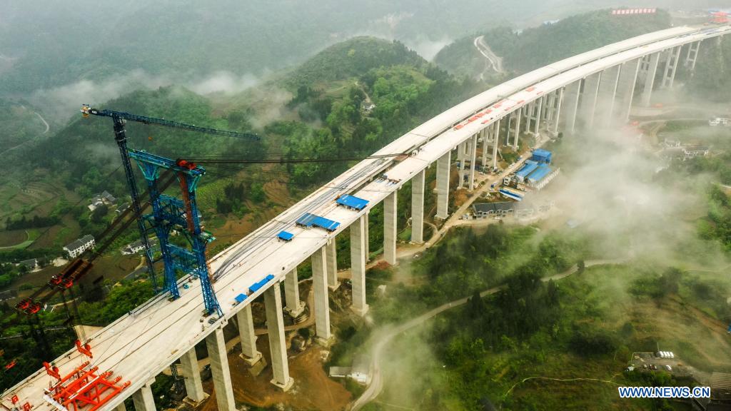 ZUNYI, 23 avril (Xinhua) -- Aperçu du chantier du grand pont de Dafaqu de l'autoroute Renhuai-Zunyi dans la province chinoise du Guizhou (sud-ouest), le 22 avril 2021. Le pont, d'une longueur de 1.427 mètres et d'une largeur de 33 mètres, est l'un des projets clés le long de l'autoroute. (Photo : Yang Wenbin)