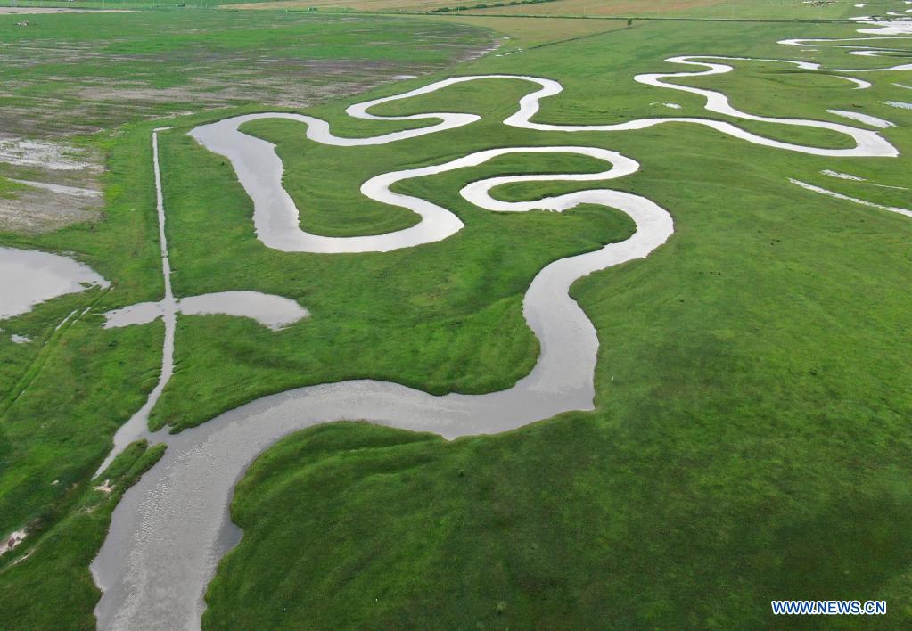 ZHANGJIAKOU, 19 juillet (Xinhua) -- Vue aérienne d'une prairie dans l'arrondissement de gestion de Saibei, à Zhangjiakou, dans la province chinoise du Hebei (nord), le 17 juillet 2021. (Photo : Wu Diansen)