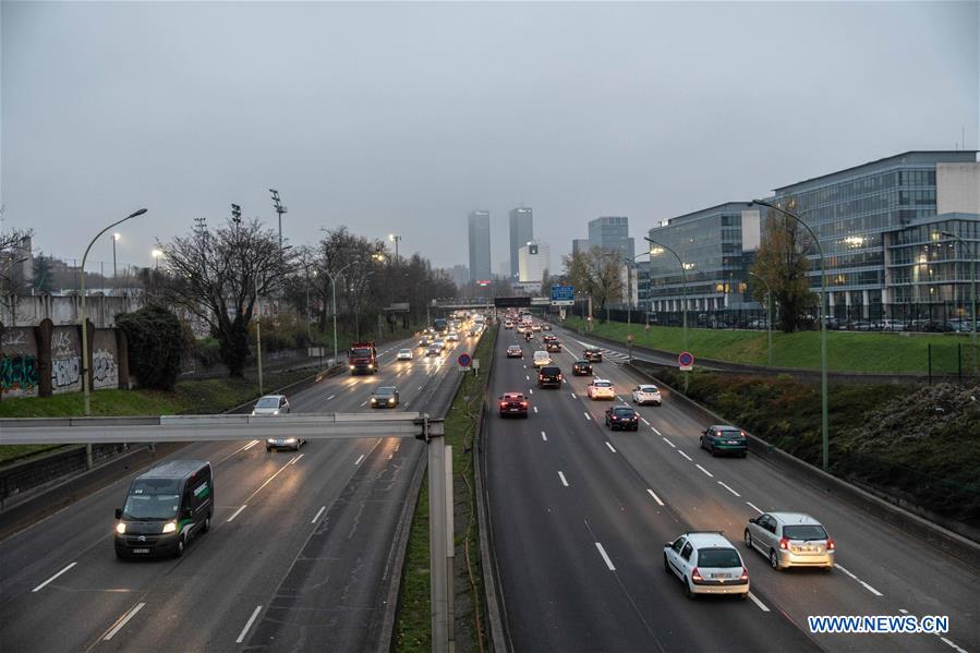 PARIS, 6 décembre (Xinhua) -- La photo prise le 5 décembre 2019 montre une circulation peu dense sur le périphérique lors des heures de pointe à Paris, en France, car de nombreux habitants choisissent de rester chez eux lors de la grève. Les gares et les stations de métro étaient désertes, les écoles fermées, et de nombreux vols cloués au sol à travers la France jeudi, alors que les syndicats du pays avaient organisé une grève nationale pour forcer le président Emmanuel Macron à abandonner la réforme des retraites. (Photo : Aurélien Morissard)