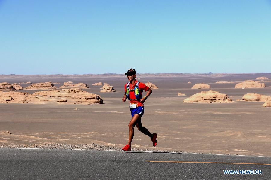 Le 4 octobre, un homme participe au Ultra Marathon au Parc géologique national de Yadan à Dunhuang (Gansu, nord-ouest de la Chine). (Xinhua/Zhang Xiaoliang)