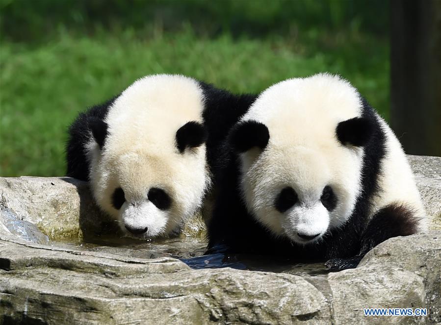 Les pandas géants jumeaux Yu Bao et Yu Bei s'amusent dans le zoo de Chongqing, à Chongqing (sud-ouest de la Chine), le 11 juillet 2017. Le zoo a fait une fête pour célébrer mardi le premier anniversaire de ces pandas géants jumeaux. (Xinhua/Tang Yi)