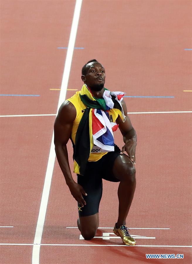 LONDRES, 6 août (Xinhua) -- Le Jamaïcain Usain Bolt après la finale du 100m lors de la deuxième journée des Mondiaux d'athlétisme 2017 à Londres, au Royaume-Uni, le 5 août 2017. Usain Bolt a remporté le bronze avec un temps de 9,95 secondes. (Photo : Luo Huanhuan)