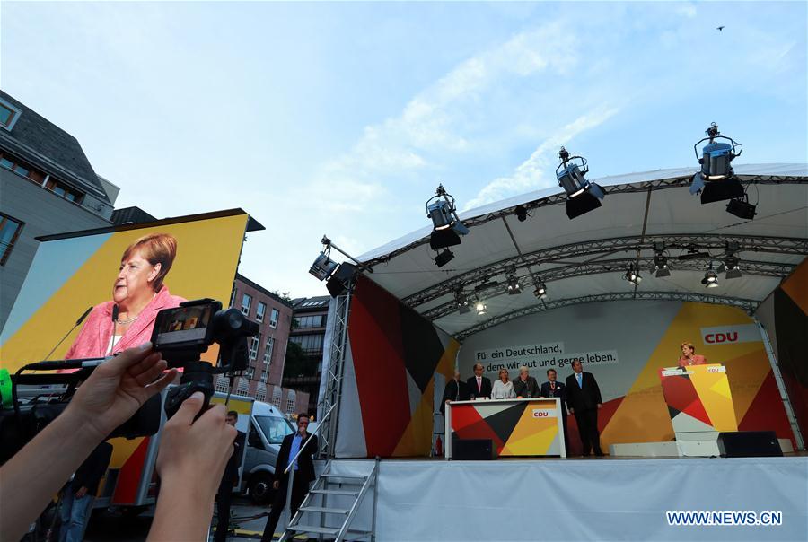 FULDA, 26 août (Xinhua) -- La chancelière allemande, Angela Merkel, participe à un rassemblement électoral dans le cadre des élections fédérales allemandes, à Fulda en Allemagne, le 25 août 2017. Les Allemands éliront un nouveau parlement fédéral le 24 septembre. (Photo : Luo Huanhuan)
