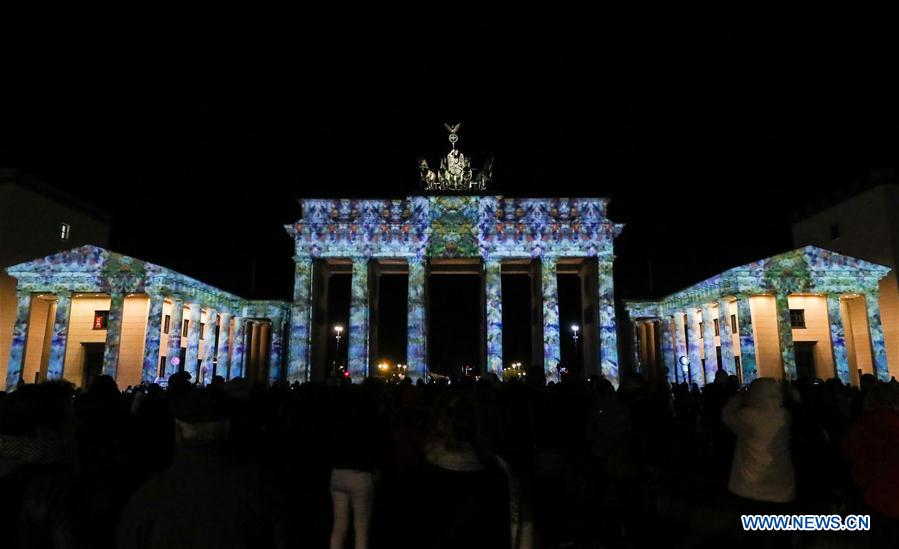 La porte de Brandebourg illuminée lors du Festival des lumières à Berlin, capitale de l'Allemagne, le 6 octobre 2017. Le Festival des lumières à Berlin se déroule cette année du 6 au 15 octobre. (Xinhua/Shan Yuqi)
