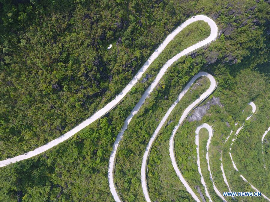Photo prise le 27 juillet 2017 montrant une route sinueuse dans le bourg de Longwan du district de Du'an, dans la région autonome Zhuang du Guangxi (sud de la Chine). A la fin de 2017, le longueur des routes rurales atteint 98,373 kilomètres au Guangxi. (Xinhua/Lu Boan)