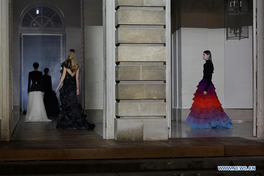Des mannequins présentent des créations de la collection Haute Couture printemps-été 2018 de Givenchy lors de la semaine de la mode à Paris, en France, le 23 janvier 2018. (Xinhua/Piero Biasion)