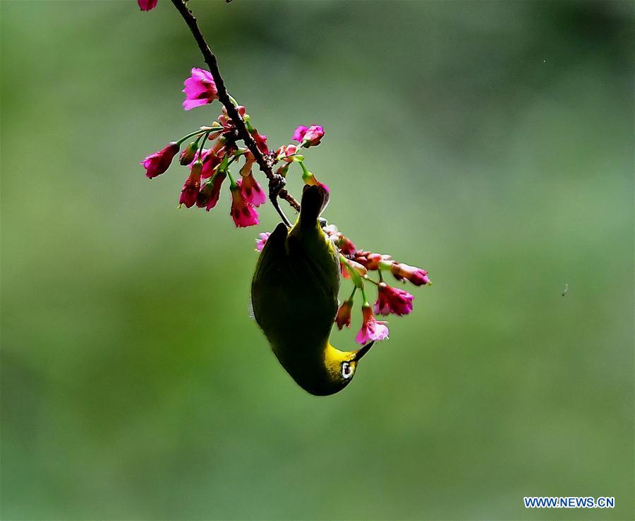 Photo prise le 27 février 2018 montrant un oiseau et des fleurs de cerisier dans le site touristique de Wushan à Fuzhou, capitale de la province du Fujian (sud-est de la Chine). (Xinhua/Mei Yongcun)