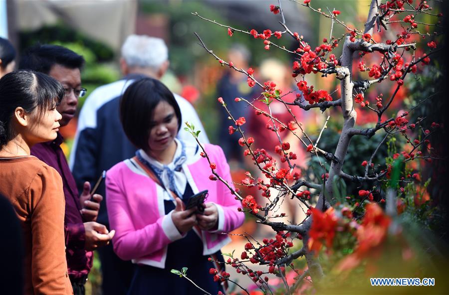 Des gens achètent des plantes pour accueillir la prochaine Fête du Printemps dans un marché aux fleurs à Haikou, capitale de la province de Hainan (sud de la Chine), le 27 janvier 2019. (Xinhua/Guo Cheng)