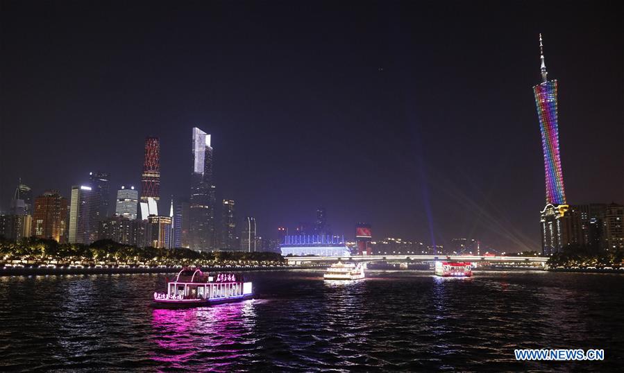 GUANGZHOU, 29 septembre (Xinhua) -- Spectacle de lumières organisé au bord de la rivière des Perles pour célébrer le 70e anniversaire de la fondation de la République populaire de Chine (RPC) à Guangzhou, capitale de la province chinoise du Guangdong (sud), le 28 septembre 2019. (Photo : Huang Guobao)
