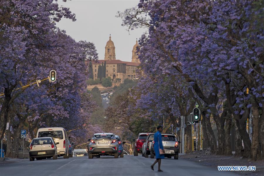 PRETORIA, Afrique du Sud, 21 octobre (Xinhua) -- Jacarandas en fleurs dans une rue de Pretoria, en Afrique du Sud, le 20 octobre 2019. (Photo : Chen Cheng)