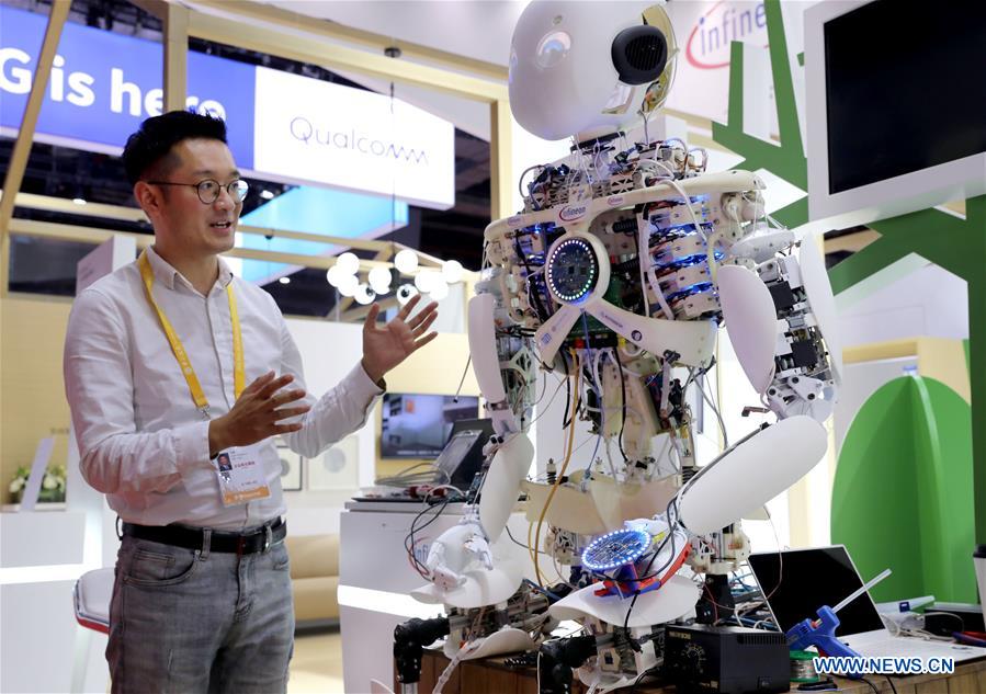 SHANGHAI, 4 novembre (Xinhua) -- Un exposant présente un robot pour la deuxième édition de l'Exposition internationale d'importation de la Chine (CIIE) au Centre national des expositions et des congrès de Shanghai, dans l'est de la Chine, le 3 novembre 2019. L'aménagement du site de la CIIE est pratiquement terminé, quelques exposants finalisant la présentation de leurs stands. La deuxième édition de la CIIE se déroulera du 5 au 10 novembre à Shanghai. (Photo : Liu Ying)