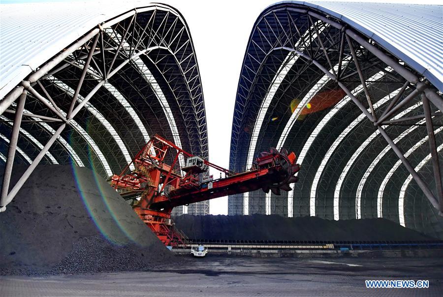 TANGSHAN, 22 décembre (Xinhua) -- Photo prise le 21 décembre 2019 montrant un empileur de charbon dans un hangar du port de Caofeidian à Tangshan, dans la province du Hebei (nord). Cette année, de janvier à novembre, il est entré 60,156 millions de tonnes de charbon dans le port de Caofeidian, à Tangshan, tandis que 61,708 millions de tonnes en sont sorties. (Photo : Yang Shiyao)