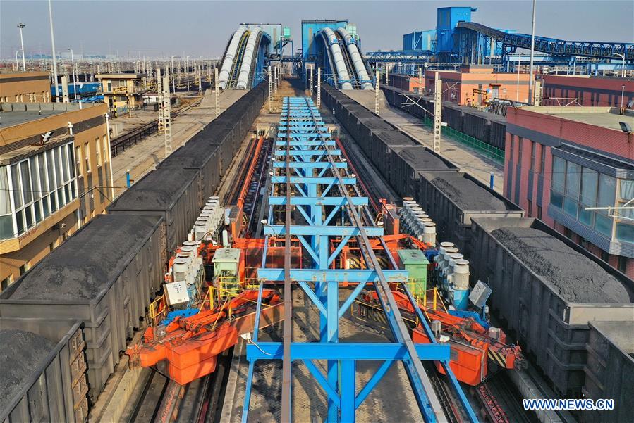 TANGSHAN, 22 décembre (Xinhua) -- Photo aérienne prise le 21 décembre 2019 montrant un train chargé de charbon attendant d'être déchargé dans le port de Caofeidian à Tangshan, dans la province du Hebei (nord). Cette année, de janvier à novembre, il est entré 60,156 millions de tonnes de charbon dans le port de Caofeidian, à Tangshan, tandis que 61,708 millions de tonnes en sont sorties. (Photo : Yang Shiyao)
