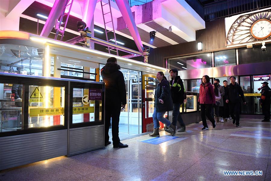 CHONGQING, 24 décembre (Xinhua) -- Des passagers entrent dans un téléphérique traversant le fleuve Yangtsé, à Chongqing, dans le sud-ouest de la Chine, le 23 décembre 2019. Un téléphérique au-dessus du fleuve Yangtsé a rouvert à Chongqing après des travaux de modernisation, selon son exploitant. (Photo : Tang Yi)