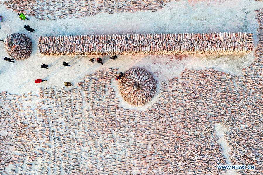 SONGYUAN, 29 décembre (Xinhua) -- Photo aérienne montrant le supermarché au poisson du lac Chagan, dans la ville de Songyuan de la province chinoise du Jilin (nord-est), le 27 décembre 2019. Un festival touristique sur le thème de la pêche hivernale s'est ouvert samedi sur le lac Chagan recouvert de glace. Le lac Chagan est un des plus grands lacs d'eau douce de Chine. Il est connu pour sa tradition séculaire de pêche sur glace. (Photo : Zhang Nan)