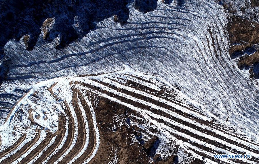 Photo prise le 19 janvier 2020 montrant le paysage enneigé dans le bourg du Guanzhuang du district de Yanchuan à Yan'an, dans la province chinoise du Shaanxi (nord-ouest). (Xinhua/Zhang Bowen)