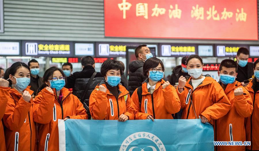 GUIYANG, 22 février (Xinhua) -- Les membres de l'équipe médicale posent pour une photo de groupe avant de partir pour la province du Hubei à l'aéroport international Longdongbao à Guiyang, dans la province du Guizhou (sud-ouest de la Chine), le 22 février 2020. Le 9e groupe de 176 personnels médicaux du Guizhou est parti samedi pour la province du Hubei pour combattre l'épidémie du nouveau coronavirus. (Photo : Tao Liang)