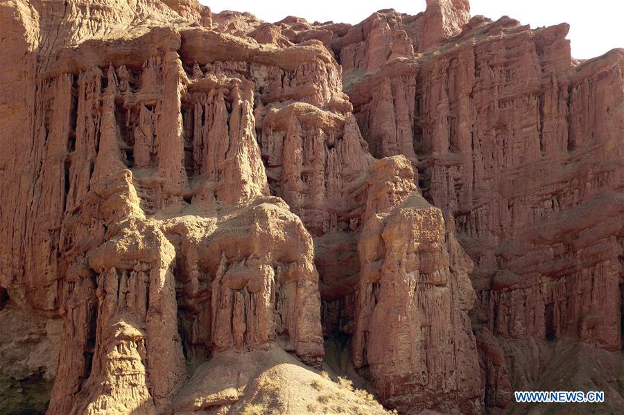 Photo aérienne prise le 24 mars 2020 montrant le paysage du relief Danxia dans le parc géologique national Danxia à Zhangye, dans la province du Gansu (nord-ouest de la Chine). (Xinhua/Fan Peishen)