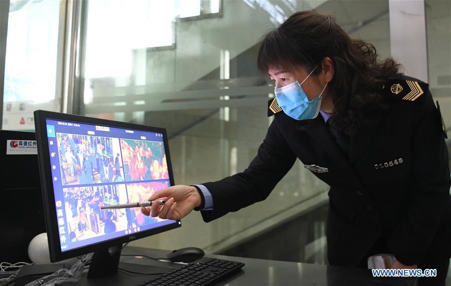 WUHAN, 29 mars (Xinhua) -- Un membre du personnel surveille les températures des passagers dans la gare de Wuhan, dans la province chinoise du Hubei (centre), le 28 mars 2020. La reprise des voyages à destination de Wuhan a débuté samedi dans 17 gares de la ville. (Photo : Cheng Min)