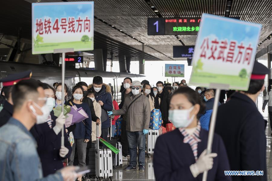 WUHAN, 29 mars (Xinhua) -- Des passagers attendent de sortir de la gare de Wuhan, dans la province chinoise du Hubei (centre), le 28 mars 2020. La reprise des voyages à destination de Wuhan a débuté samedi dans 17 gares de la ville. (Photo : Fei Maohua)