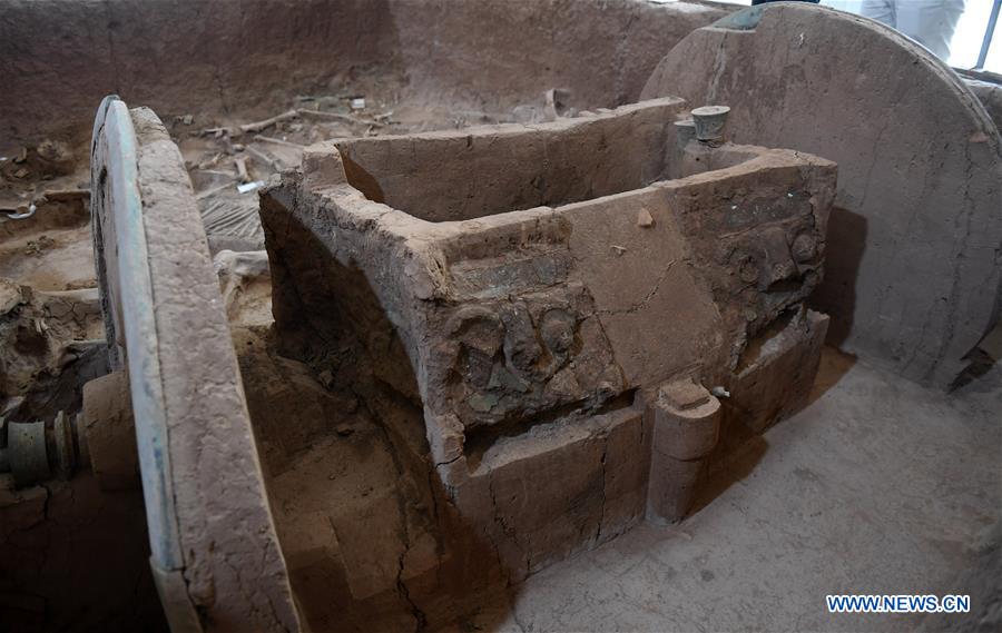 XI'AN, 31 juillet (Xinhua) -- Une partie d'un chariot en bronze restauré dans une base de l'Institut provincial d'archéologie du Shaanxi, à Xi'an, dans la province chinoise du Shaanxi (nord-ouest), le 30 juillet 2020. (Photo : Li Yibo)