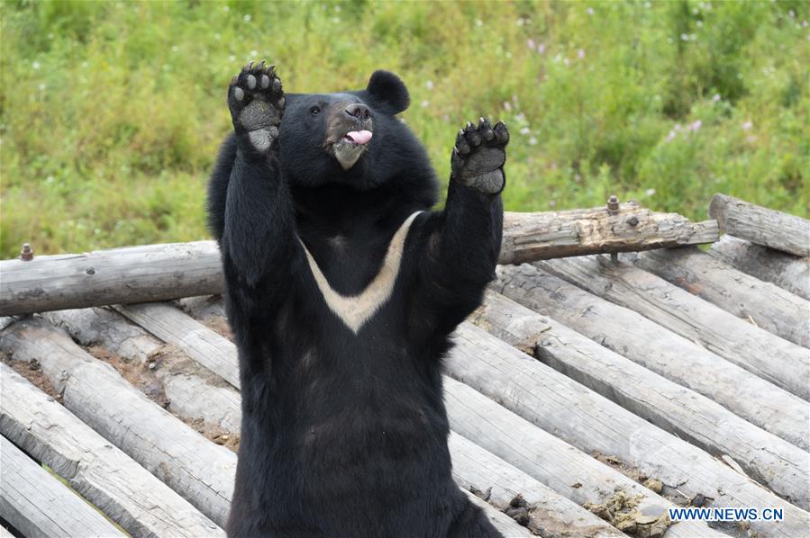 Photo prise le 7 août montrant un ours noir dans un parc à ours sur l'île de Heixiazi à Fuyuan, dans la province du Heilongjiang (nord-est de la Chine). (Xinhua/Xie Jianfei)