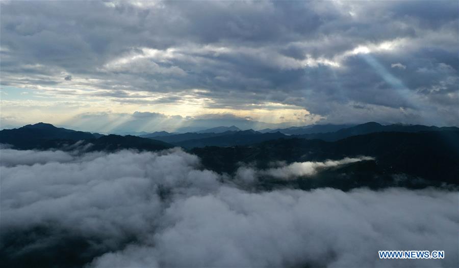 Une mer de nuages au-dessus du village de Dangjiu du district autonome Miao de Rongshui, dans la région autonome Zhuang du Guangxi (sud de la Chine), le 15 août 2020. (Xinhua/Huang Xiaobang)