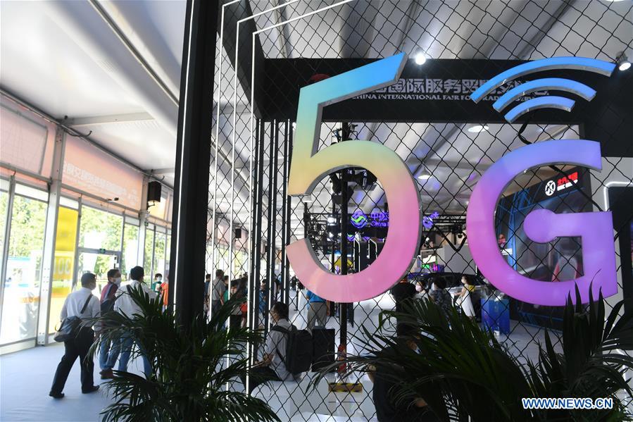 BEIJING, 7 septembre (Xinhua) -- Des gens visitent la zone d'exposition dédiée aux services de communications 5G au Salon international du commerce des services de Chine 2020, à Beijing, capitale chinoise, le 7 septembre 2020. Le salon se déroule du 4 au 9 septembre à Beijing. (Photo : Lu Peng)