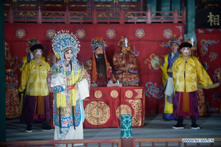 BEIJING, 29 septembre (Xinhua) -- Des acteurs sur scène durant un spectacle d'opéra retransmis en direct intitulé "Opéra légendaire", au théâtre Deheyuan du Palais d'été, à Beijing, capitale chinoise, le 28 septembre 2020. Réunissant 20 acteurs nationaux de première classe, le spectacle d'opéra est retransmis en direct depuis le Palais d'été de Beijing pendant trois nuits consécutives à partir de lundi. (Photo : Peng Ziyang)