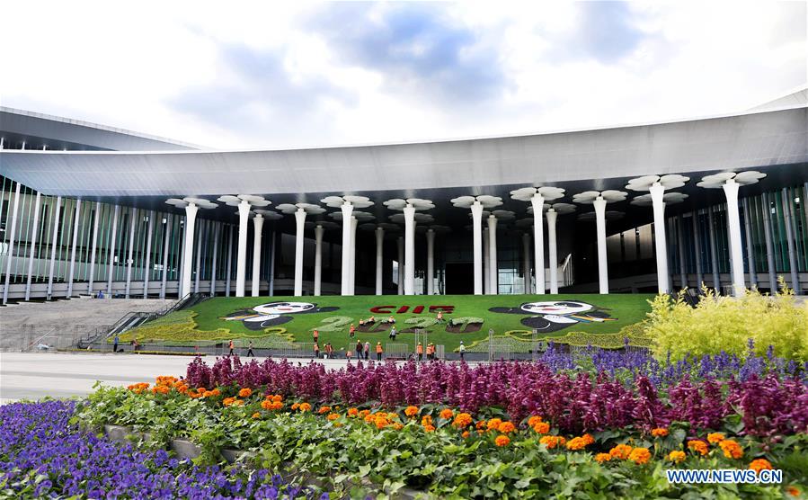 SHANGHAI, 15 octobre (Xinhua) -- Des jardiniers préparent des décorations florales pour la 3e édition de l'Exposition internationale d'importation de la Chine (CIIE), sur une place du Centre national des expositions et des congrès de Shanghai, dans l'est de la Chine, le 14 octobre 2020. La 3e CIIE se déroulera du 5 au 10 novembre à Shanghai. (Photo : Fang Zhe)