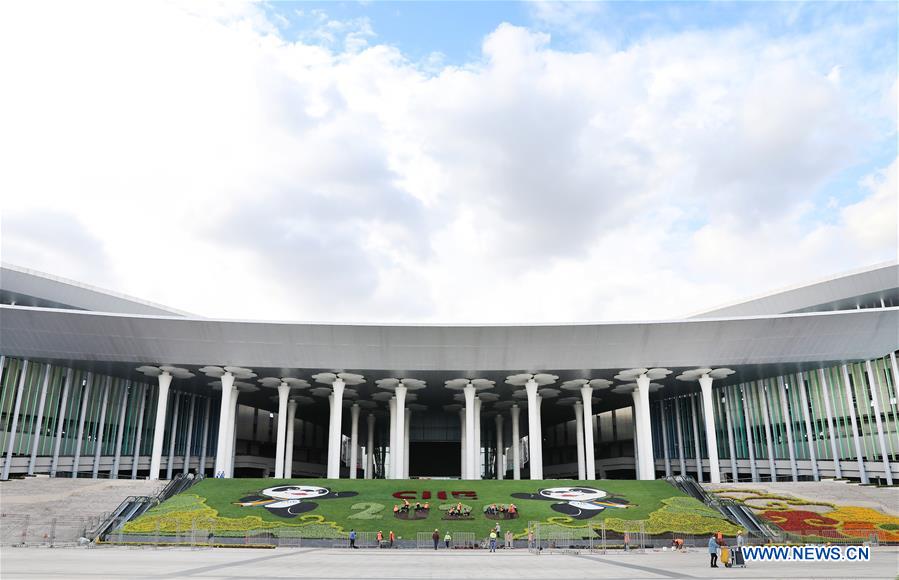 SHANGHAI, 15 octobre (Xinhua) -- Des jardiniers préparent des décorations florales pour la 3e édition de l'Exposition internationale d'importation de la Chine (CIIE), sur une place du Centre national des expositions et des congrès de Shanghai, dans l'est de la Chine, le 14 octobre 2020. La 3e CIIE se déroulera du 5 au 10 novembre à Shanghai. (Photo : Fang Zhe)