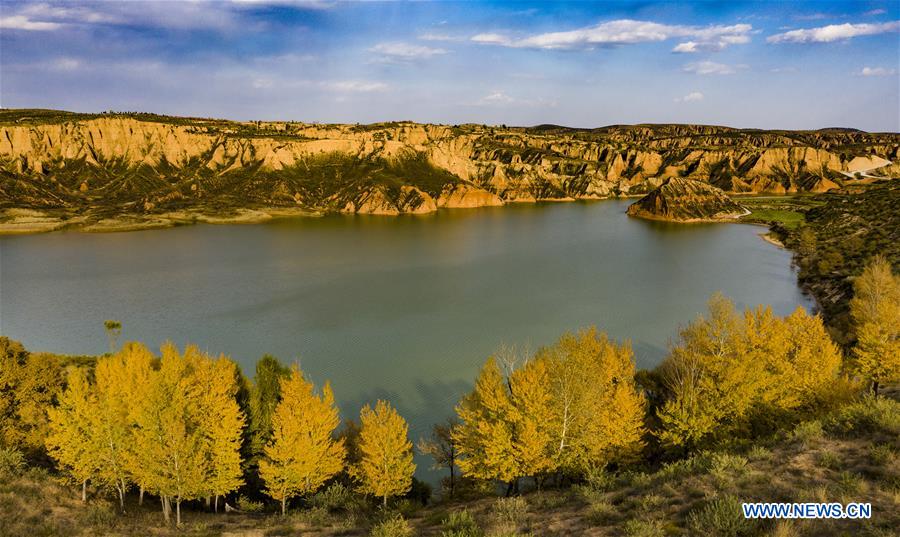 YULIN, 17 octobre (Xinhua) -- Photo aérienne du paysage du géoparc de loess de Mahuangliang, dans le bourg de Mahuangliang à Yulin, ville de la province chinoise du Shaanxi (nord-ouest), le 16 octobre 2020. Le géoparc de 37 kilomètres carrés a été récemment ouvert au public. (Photo : Tao Ming)