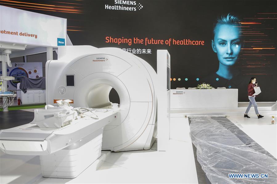SHANGHAI, 5 novembre (Xinhua) -- Un personnel passe devant la zone d'exposition des équipements médicaux et des produits de santé de la troisième Exposition internationale d'importation de la Chine (CIIE), à Shanghai, dans l'est de la Chine, le 3 novembre 2020. (Photo : Zhang Yuwei)